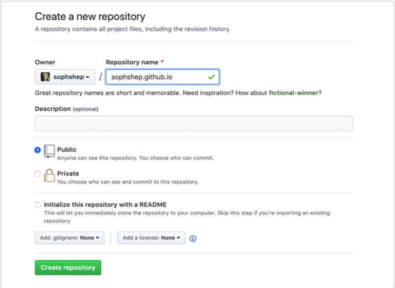 仮にアカウント名が「yoshiki」であればリポジトリ名は「yoshiki.github.io」と入力します。