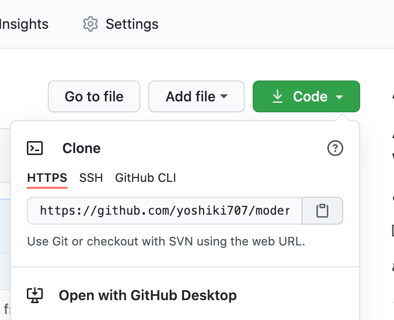 リポジトリのトップページから、Cloneを押すとURLが発行されています。