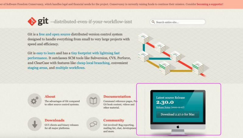 ちなみに、Gitの最新のバージョンは公式サイトから確認する事ができます。