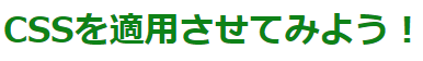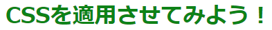 <h1 style="color: green">CSSを適用させてみよう!</h1>このように、h1の開始タグ内にstyle=”color:green;”と記述することで適用できます。