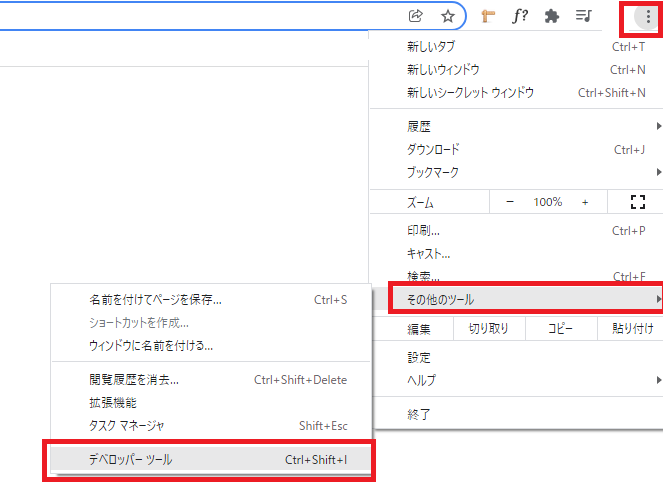 ブラウザ上でCSSのコードを確認するには「デベロッパーツール」を使います。ブラウザによっては「開発者ツール」とも呼ばれます。「設定」⇒「その他のツール」⇒「デベロッパーツール」で表示させることができます。ショートカットとして「F12」または「Ctrl+shift+ i」でも表示可能です。