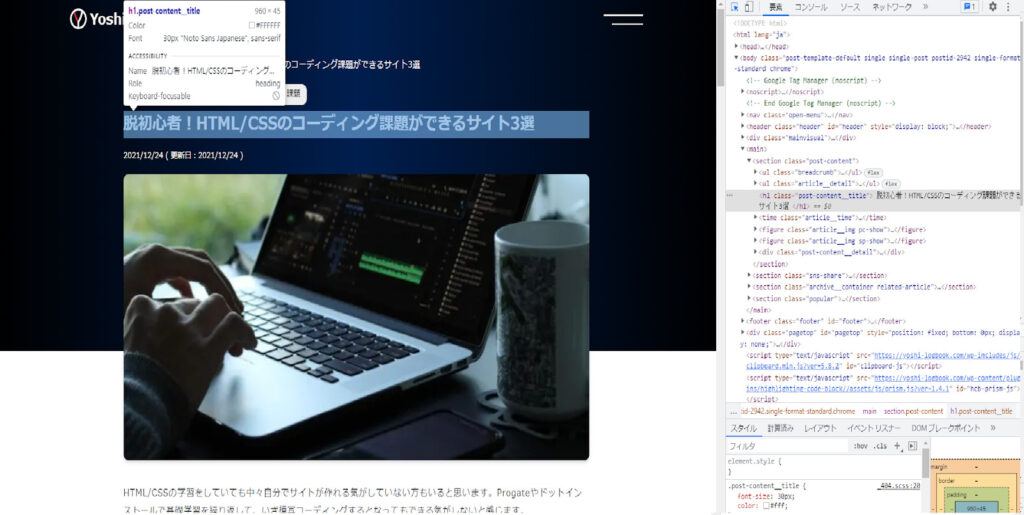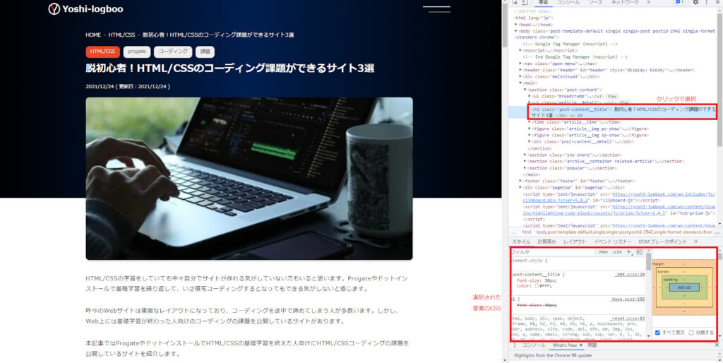 すると、マウスポインタを要素の上に載せると要素のコンテンツが青色や緑色などで囲われます。クリックするとデベロッパーツールの該当するHTMLの要素が選択されて、下部分にはCSSが表示されます。下画像では記事タイトルを選択した場合です。