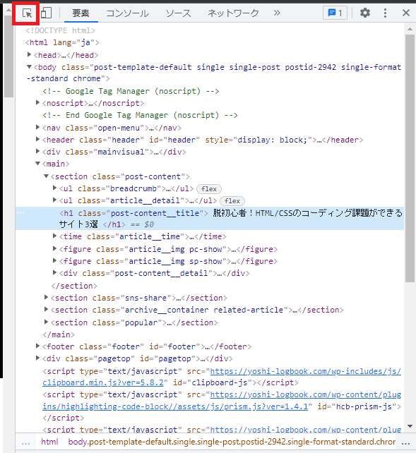 デベロッパーツールではWebページの表示をクリックするだけで要素を指定することができます。デベロッパーツールの左上の「ページ内の要素を選択して検査」です(下画像の分か枠部)。