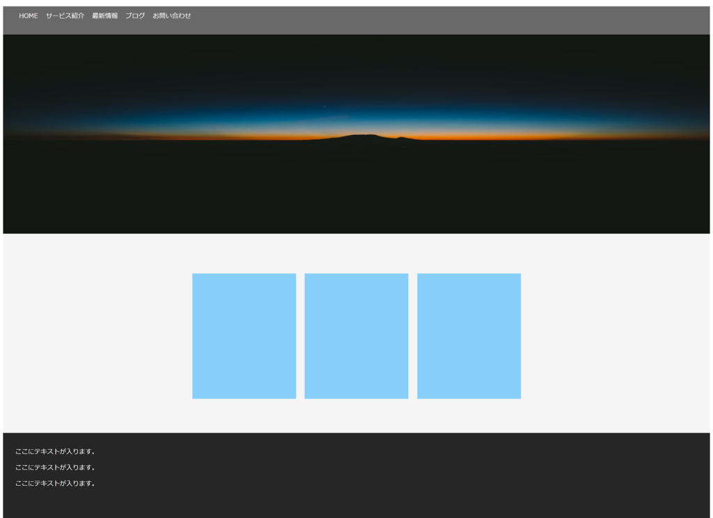 先ほどふれた「block」というclass名の要素は、横幅を260px、高さを315pxにしています。また、「margin-top: 100px;」とすることでヘッダーとの間に余白を空けています。背景色は、lightskyblue(ライトスカイブルー)にしています。