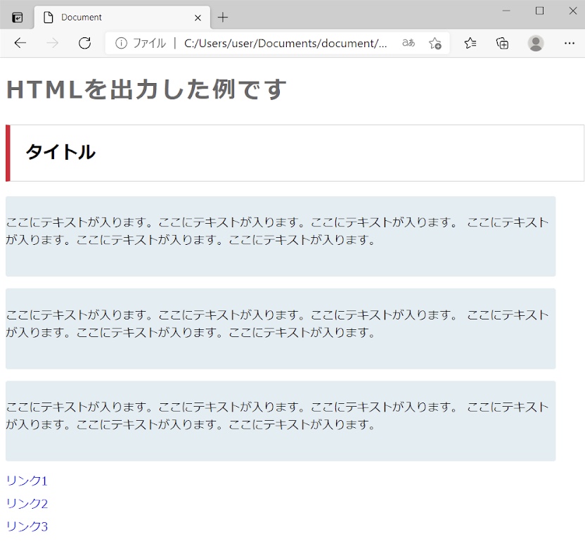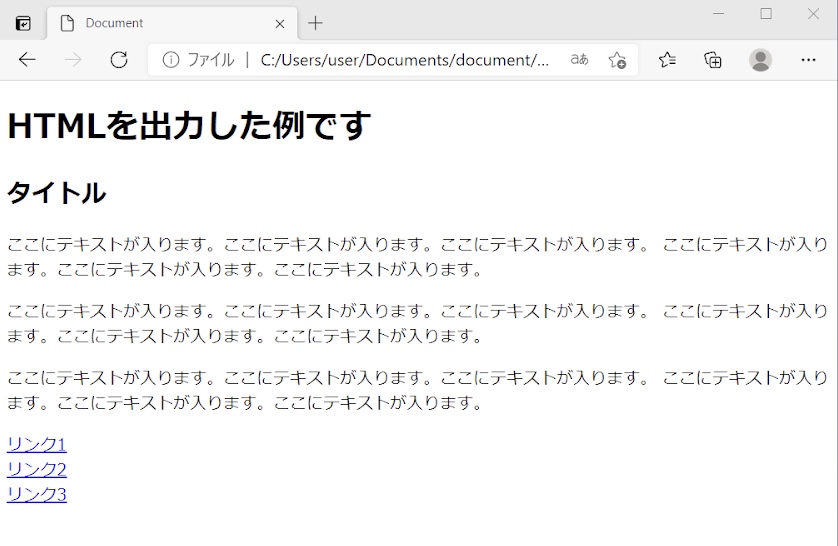 <div><a href="#">リンク3</a></div>このコードをブラウザで表示すると、下のようになります(※ブラウザとは、ChromeやSafari、Firefoxなどのことです)。