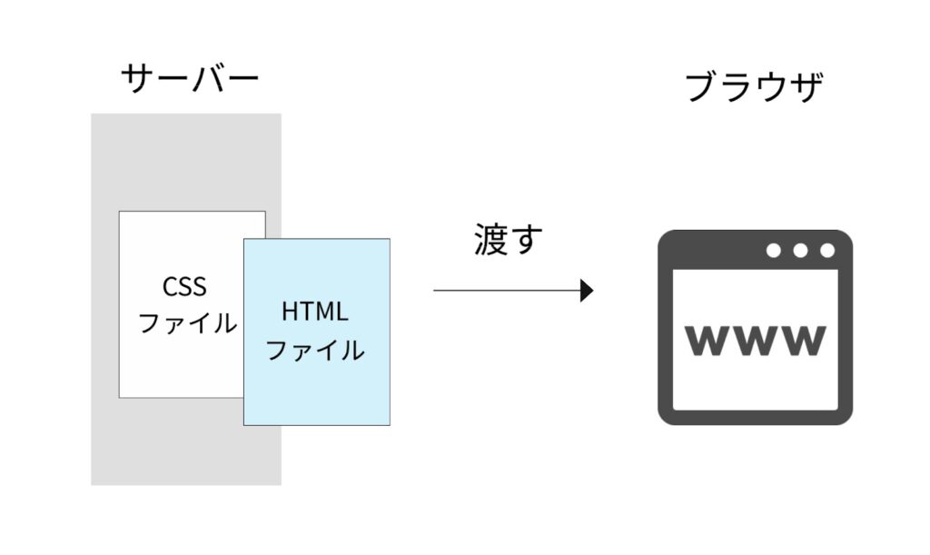 また、CSSのファイルもHTMLと同様サーバーからブラウザに渡されます(先ほどの図にCSSファイルを追加しておきました↓)。