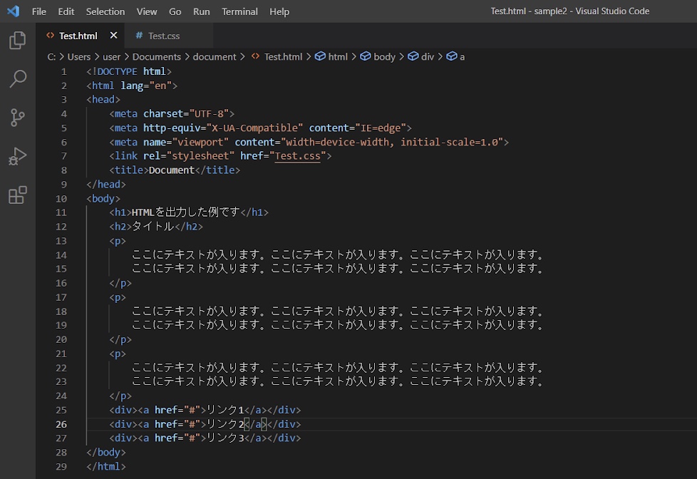 ※ちなみに上のコードは、HTMLファイルを書くときに定型的に書くコードです(このコードにはショートカットが存在します)。HTMLファイルに定型的に書くコードに関しては、以下の記事を読んでみてください。