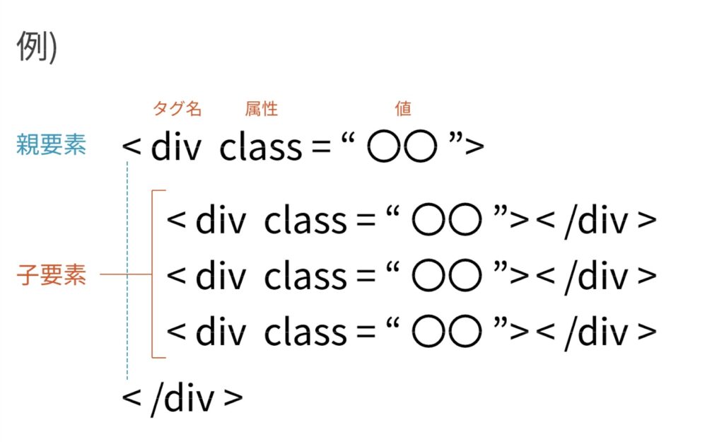 外側のにあるタグを「親要素」、内側のタグを「子要素」といいます。