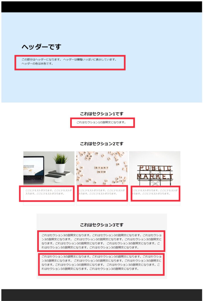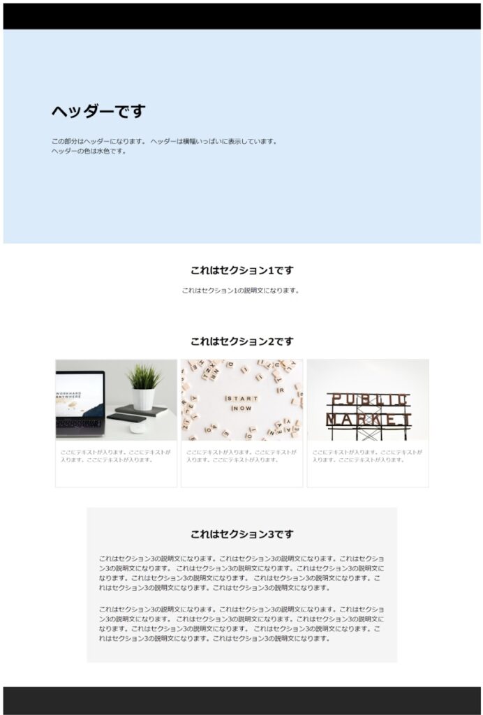 ※一番下のセクション3ではpタグを連続して使いました。pタグの要素同士のあいだが自動で空いています。