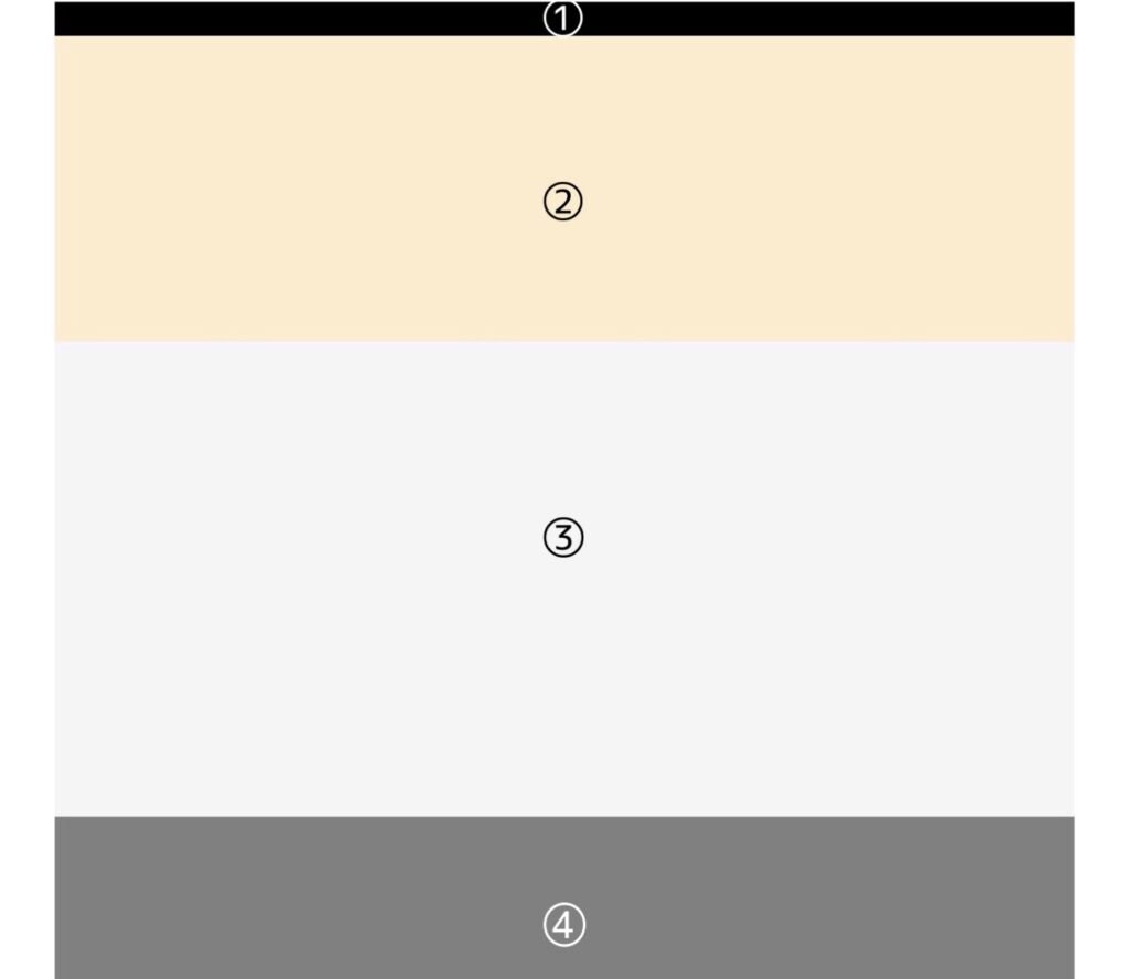 上から、①ナビゲーションバー②ヘッダー③本文を書くスペース④フッターとなります。