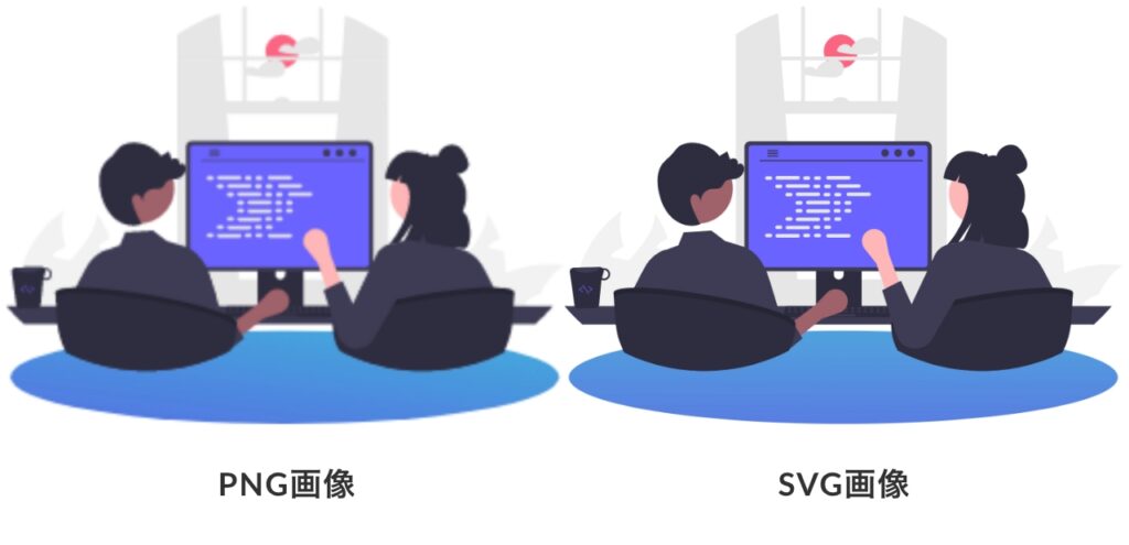 PNG画像とSVG画像の大きさを拡大して比較してみました。左のPNG画像がぼやけているのに対してSVG画像は綺麗に表示されているのがわかると思います。