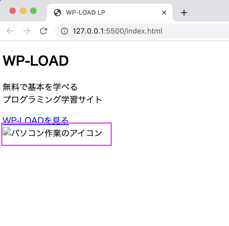 <img src="./images/mainvisual.svg" alt="パソコン作業のアイコン" />altは画像が表示されなかった場合テキストとして表示されるものです。