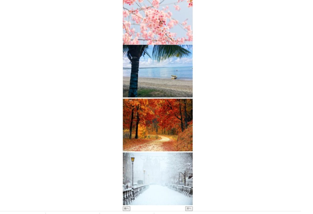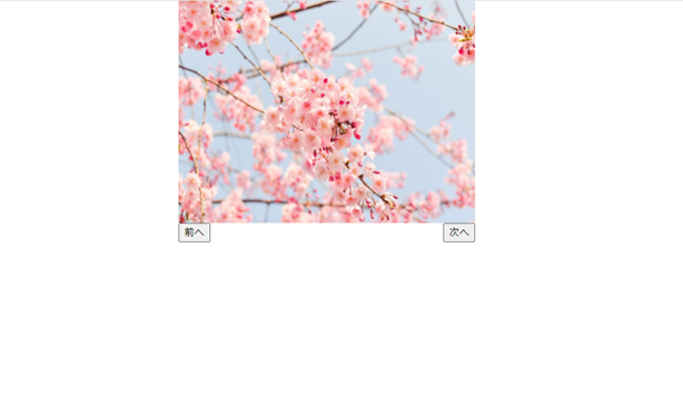</style>すると、画像が無くなり、「前へ」と「次へ」のみが表示されています。最初に表示しておく画像がありませんが、jQueryで表示させます。CSSのコードの段階では全部非表示にするようにしましょう。