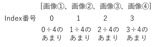 単純に+1していくだけでは最後の画像から先は表示されませんよね。そのために、余りを使います。例えば、4枚の画像を表示させたいときは4で割ったときの余りを使います。すると0~3までの4種類の数字をindexに入れることができます(下図参照)。そのため、最後の<img>の後は最初の<img>に戻ることになります。