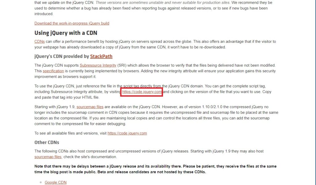 上図のDownloadをクリックします。すると、様々なDownload方法が紹介されています。今回は、下の方にスクロールして「Using jQuery with a CDN」までいき、下図の赤枠の部分のリンクをクリックします。