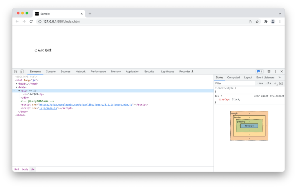 divタグ内に、「sample.txt」で記述した「こんにちは」を出力するコードは下記です。
