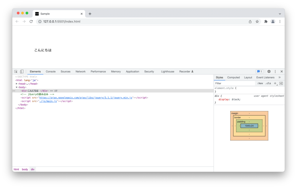 「sample.txt」に「こんにちは」と書かれているとします。そうすると、指定したdiv要素に「こんにちは」という文字が表示される仕組みです。