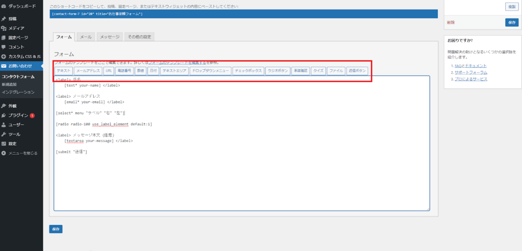 インストールが完了し、有効化すると左のメニューに「問い合わせ」という項目が追加されます。フォームを作るには「問い合わせ」⇒「新規追加」をクリックします。すると、下記のような画面になります。