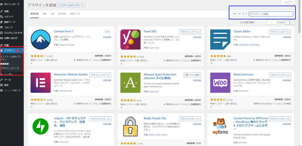 Contact form7はダッシュボードよりインストールすることができます。まず、ダッシュボードから「プラグイン」→「新規追加」を選択します(赤枠部)。右上の検索窓に「Contact form 7」と入力してください(青枠部)。