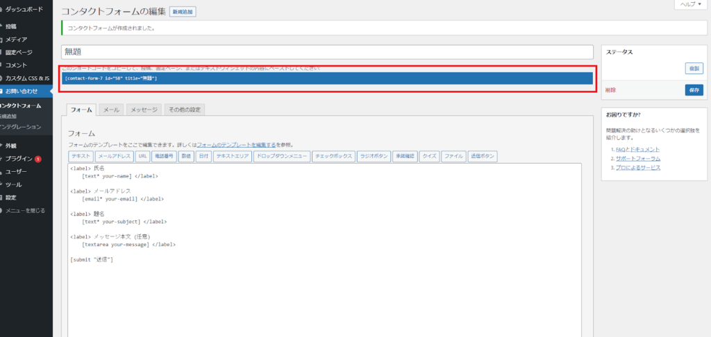 設定がおわったら、ページにフォームを挿入します。挿入方法はショートコードをコピーして貼り付けるだけです。ショートコードは先ほどのコンタクトフォームの編集画面にあります(赤枠部)。このコードをそのままフォームを入れたい部分にコピー&ペーストして下さい。