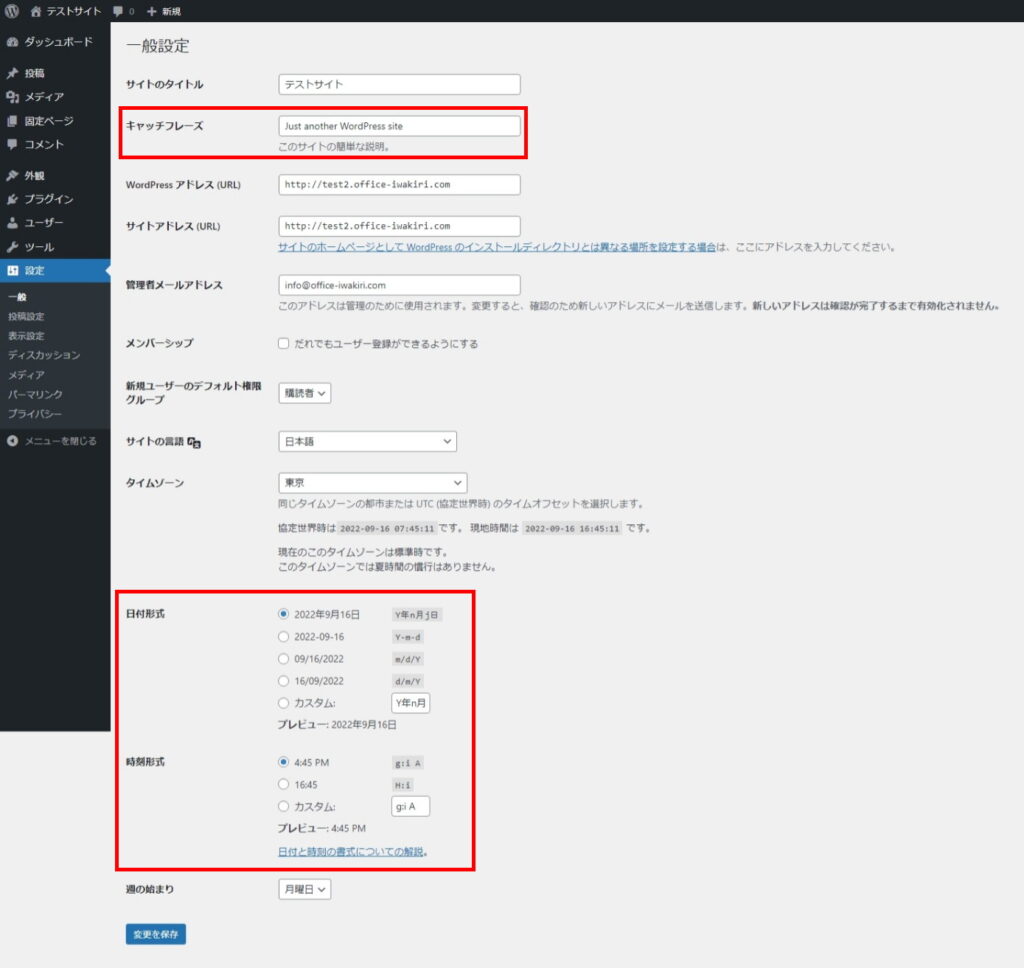 このページには、インストール時に設定した「サイトタイトル」や「管理者メールアドレス」が表示されているかと思います。これらの情報を変更する場合は、ここから行いましょう。