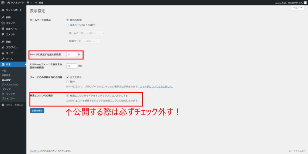 但し、「検索エンジンがサイトをインデックスしないようにする」のチェック欄はよく確認してチェックのON/OFFをしましょう。