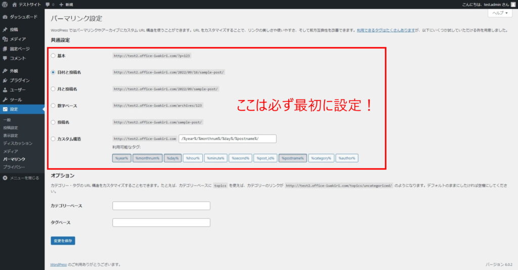 この画面では、「パーマリンク」という、ブログ記事のURLの決め方を設定します。