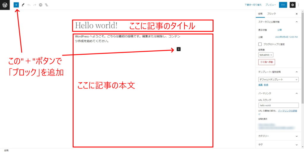 最新のWordPressの場合、基本的には下図の様な「ブロックエディタ」というものを使用して記事を書いていきます。