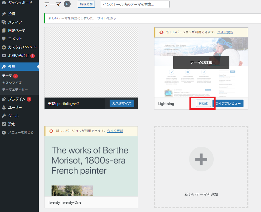 テーマの有効化をするには「外観」⇒「テーマ」のページからです。使いたいテーマにカーソルを持っていきます。そして、「有効化」のボタンで選択すれば、テーマが変更されます。