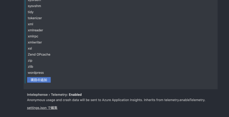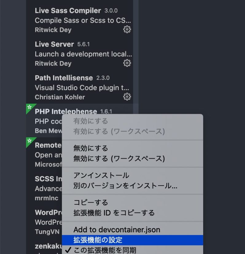 インストール済みプラグインの中からPHP Intelephenseを右クリックすると、拡張機能の設定という項目が出てくるので、開きましょう。