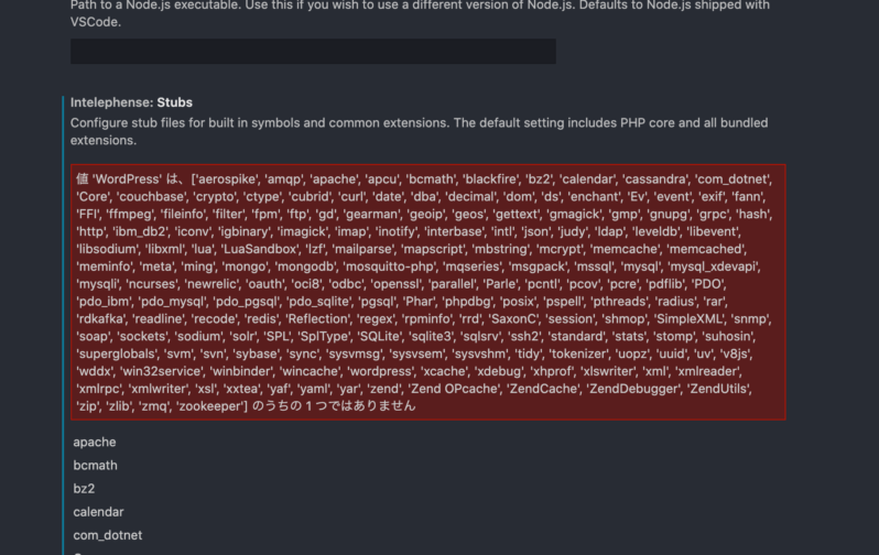 VSCodeでWordPressテーマをカスタマイズする場合には、PHP Intelephenseの設定項目から「wordpress」を追加してあげる事で解消することが出来ます。